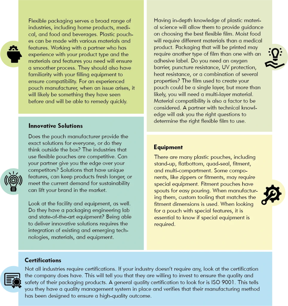 Your plastic pouch manufacturer is a critical component of your supply chain. Providing on-time delivery and quality products should be a given, but you should be aware of factors that could impact this. Characteristics to look for in a pouch manufacturer include experience, technical knowledge, innovative solutions, and certifications that may