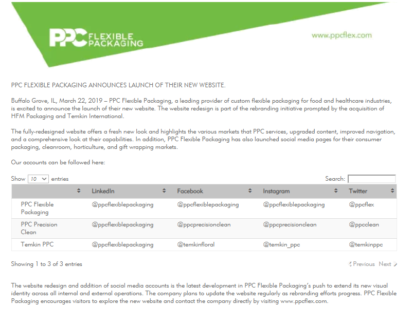 PPC Flexible Packaging Announces New Website PPC Flexible Packaging ™ ANNOUNCES LAUNCH OF THEIR NEW WEBSITE. Buffalo Grove, IL, March 22, 2019 – PPC Flexible Packaging ™, a leading provider of custom flexible packaging for food and healthcare industries, is …