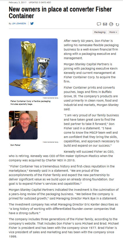 Fisher Container prints and converts pouches, bags and films in Buffalo Grove. The company’s products are used primarily in clean rooms, food and industrial end markets, Morgan Stanley said.